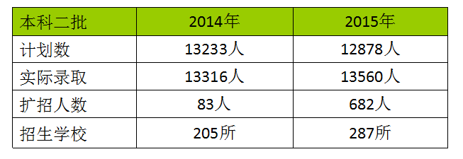 参加本科二批录取的院校共287所,计划招生12878人,实际录取13560人,比计划增加682人。其中,文史类招生计划4260人,实际录取4544人,比计划增加了284人;理工类招生计划8618人,实际录取9016人,比计划增加了398人。