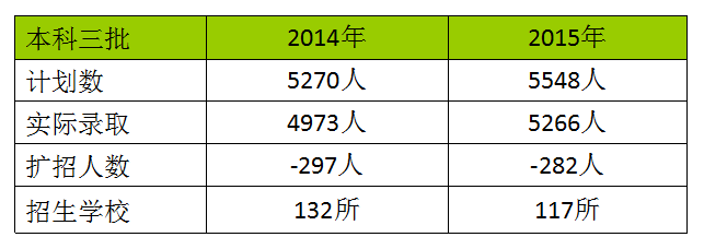 参加本科第三批录取的院校共117所,计划招生5548人,实际录取5266人,比计划减少282人。其中,文史类计划招生2343人,实际录取1737人,比计划减少606人;理工类计划招生3205人,实际录取3529人,比计划增加324人。