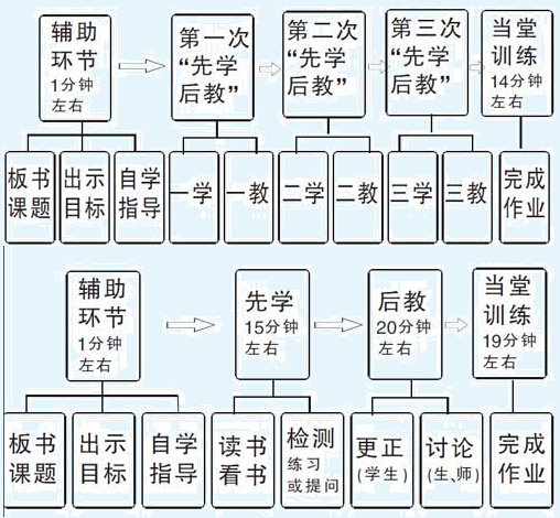 中、小学语文、英语课上常用一种其他操作方法,即一节课进行几次“先学后教”+“当堂训练”(小学是“几个比”,即“比读书”、“比写字”、“比回答问题”、“比背诵”,每一个比都是一次“先学后教”),因为语文、英语教学目标不是单一的,而是多元化的。这种操作方法课堂结构示意图如下: