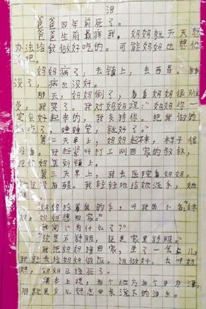 爸爸四年前死了。爸爸生前最疼我,妈妈就天天想办法给我做好吃的。可能妈妈也想他了吧。妈妈病了,去镇上,去西昌,钱没了,病也没好。那天,妈妈倒了,看看妈妈很难受,我哭了。我对妈妈说:“妈妈你一定会好起来的,我支持你,把我做的饭吃了,睡睡觉,就好了。”—节选自木苦依伍木作文《泪》