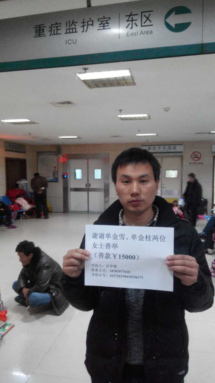 现在,父亲在河南周口市的一家医院ICU病房里接受治疗,前期已经花费了六七十万元,由于是因为打工过程中受伤,不符合农合报销标准,治疗一度陷入困境,对方家庭又不富裕,完全承担不起巨额的治疗费用。现在,幸亏像您这样的好心人出现,无论在物质上还是精神上,都给了我这个濒临破碎的家庭以极大的支持。