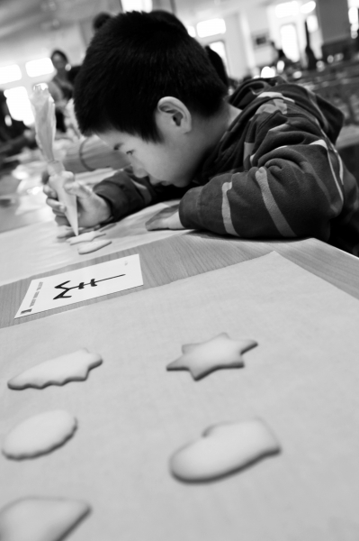 几个调皮的小男生正聚在一起商量着怎么用糖霜把饼干“铺满”。“我不写屏幕上的字,我要写饕餮的‘饕’字,不能浪费了糖霜!”“那我就写‘爨底下’的‘爨’字,比你笔画还多呢!”