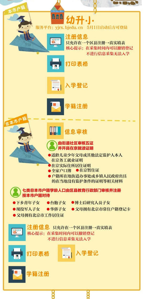 首先要确认入学登记的区县,选择对应的区县入口,在规定时间内在小学入学服务平台(yjrx.bjedu.cn)(5月1日启动后方可登陆)进行注册,注册信息的真实性需要审核,待审核通过后即可填写其他详细信息并打印信息采集表,到学校登记报名时要出示信息采集表。