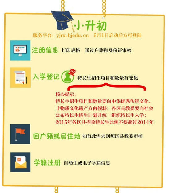 【必威体育官网网页版 3月16日消息】《北京市教育委员会关于2015年义务教育入学工作的意见》最近发布,两个变化值得关注:1、小升初的特长生招生项目和数量要向中华优秀传统文化、非物质文化遗产方向倾斜 2、允许民办学校和寄宿制招生学校在5月24日之前提前完成跨区县招生工作。