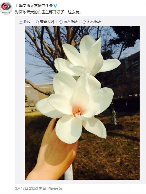 走在上海交通大学校园里,暖暖的阳光照在身上,路边开满了白色的玉兰花,香喷喷的。肥胖的花瓣让姐想到了呆萌的大白,小伙伴们脑补一下。大白大白,萌萌哒!
