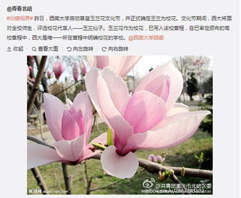 你们知道嘛,“大白”被正式确定为西南大学校花,并已写入该校章程。大白是唯一写入章程的校花。西南大学还将评选校花代言人——玉兰仙子。你们觉得我可以去试试嘛?