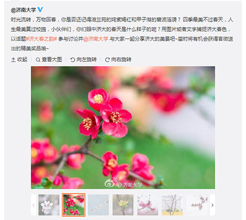 瞧,济南大学也在征集校园春景了,小礼品哪家强,山东找济大。小伙伴快去参加吧,官微说有小礼品喔。