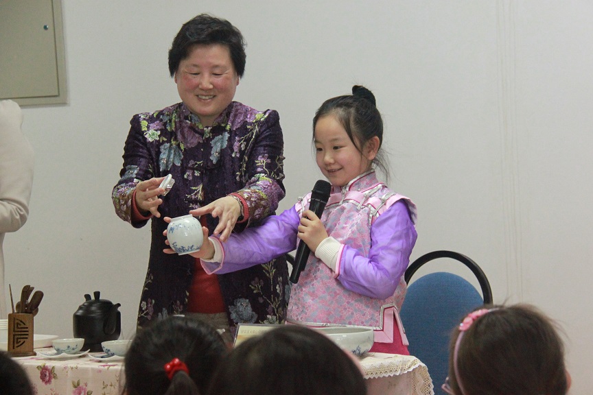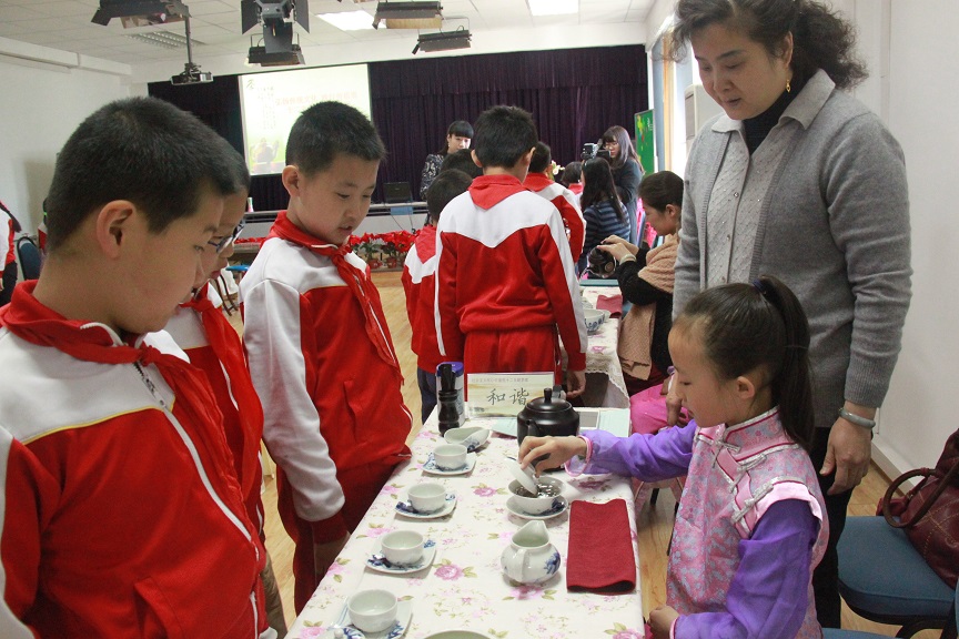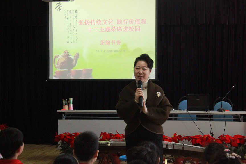 为了让社会主义核心价值观的种子在少年儿童的心中生根发芽,首先,新鲜小学六年级学生古筝伴奏,茶艺社团现场诵读《茶韵书香》,表达了对茶文化的喜爱。随后,导师团的老师与学生一道进行社会主义核心价值观茶席设计,泡茶、品茶、讲茶,进行互动。生动、精美而又各具特色的社会主义核心价值观十二主题茶席讲解,让师生饱了眼福;各自不同的茶香让同学们饱了口福,同时,对社会主义核心价值观十二主题有了更深的认识。