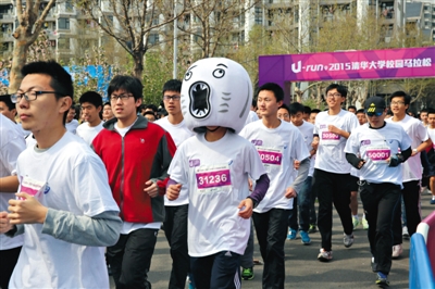 (昨日,清华大学,参赛选手从起点出发。当天,2015清华大学校园马拉松赛在清华大学校园内举办。这是北京高校首次举办专业校园马拉松赛事)
