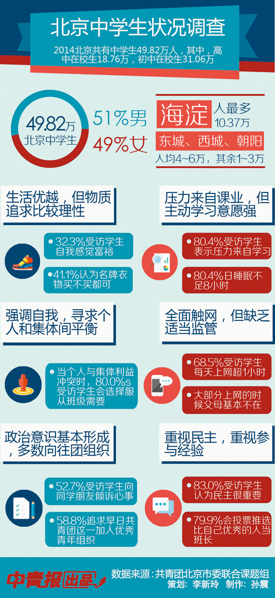 那么,姜安琪们究竟是什么样的?2014年前后,北京团市委成立北京青年1%抽样调查课题组,针对北京市16个区县初一至高三年级中学生,采用定量与定性结合,即问卷调查与深度访谈相结合的方法进行调研,来试着分析刻画这一群体。按分层整群抽样约2%的比例,该课题组共发放问卷9980份,其中初中6110份、高中3870份。