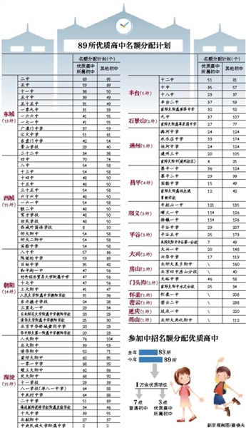 昨日,市教委发布了这89所优质高中的名单,比去年的83所新增6所,分别是东城区的22中、西城区的西城外国语学校、海淀区的十九中和中央民族大学附属中学、房山区的北京四中房山分校,以及通州区的首都师范大学附属中学(通州校区)。