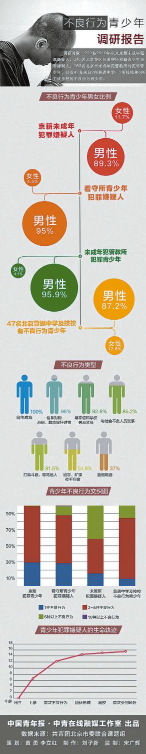 团北京市委课题组进行了一项调研,他们通过翻阅2010年以来某司法社工机构撰写的700份未成年犯罪嫌疑人司法社会调查报告,详细梳理了某区2010年以来京籍未成年犯罪嫌疑人个案233例;通过走访看守所、未管所,以问卷方式调查了247名北京各区县看守所京籍青少年犯罪嫌疑人,169名北京市未成年犯管教所的犯罪青少年;通过走访2所普通中学、3所技校和6所工读学校,以焦点小组的方式与一线教师及学校管理人员座谈,形成了47份关于不良行为青少年特点、影响因素等内容的问卷,并用数据大致勾勒出这些青少年不良行为的发展轨迹。