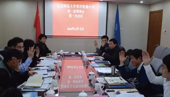 2014年12月5日上午,北京师范大学第四附属中学在北京师范大学京师大厦举行了第一届第一次理事会议。丰台教委钟灵副主任及相关科室领导、北师大基础教育对外合作办学部屈浩主任及罗丽副主任、北师大良乡附中刘建友校长、北师大第三附中李建文校长、我校吴年翔校监及郑洁校长参会。