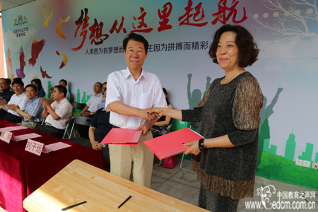 北京市日坛中学校长赵欣与北京市日坛中学实验学校校长崇静进行一体化签字互换合同