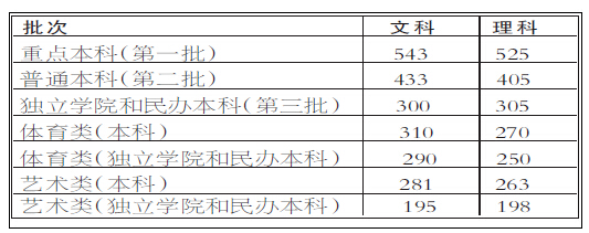理工类本科一批(含A、B类)院校538分,本科二批(含A、B阶段)院校459分;文史类本科一批(含A、B类)院校547分,本科二批(含A、B阶段)院校486分。6月23日12:00以后可以查询成绩,6月24日至6月28日12时,考生填报本科二批及以上院校志愿;7月31日至8月2日12时,考生填报本科三批院校志愿和高职高专院校志愿。