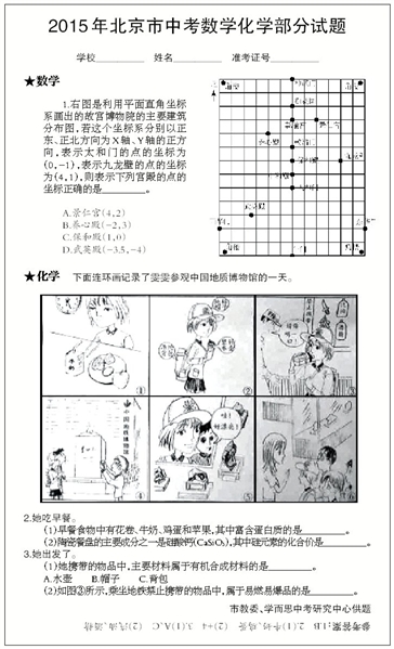 昨日,2015北京中考进入第二天,考试科目为数学、化学。与以往满篇的数字不同,今年的两张理科卷子中,也出现了图片、连环画等,出人意料。