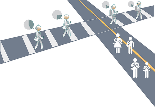 2.过马路时发消息,人的关注点聚焦在屏幕上,相比注意力集中的步行者,受道路交通事故影响的可能性增加约3.5倍。