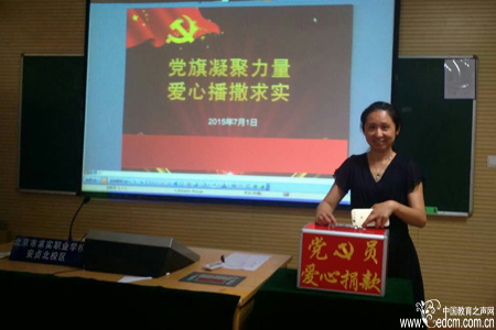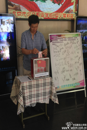 在党员献爱心活动中,北京市求实职业学校各校区党支部全体党员同志们积极响应,学校在休病假、产假或者因公外出党员让家人专门送过来、或者汇款、或者请同事垫付等方式都纷纷献出爱心。包括少数自身家庭也不宽裕的党员也慷慨解囊,他们说捐款不在多少,但是作为一名党员献出我们的爱心这是党员的一份荣誉和责任,这是我们对信仰的坚守。