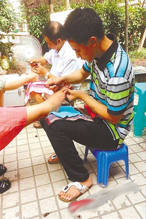 前日,记者走到巷口,就看到一位年轻的小伙在为客人修脚。