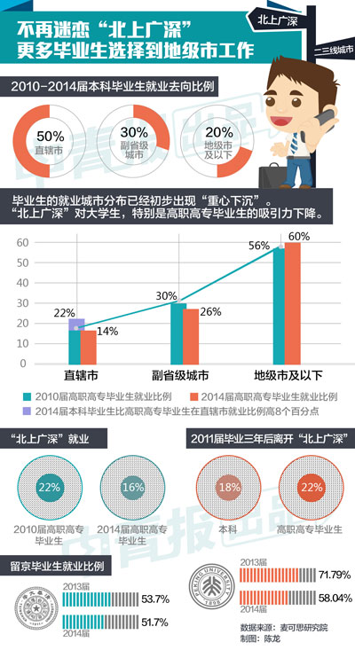 记者通过采访发现,虽然还是有一部分大学毕业生就业钟情于“北上广深”这样的大城市,但是很多人最终还是选择回家乡就业,而且这个比例在逐年增加。据麦可思研究院2014年发布的《毕业生的“后北上广”生活》显示,这一比例已超过六成。