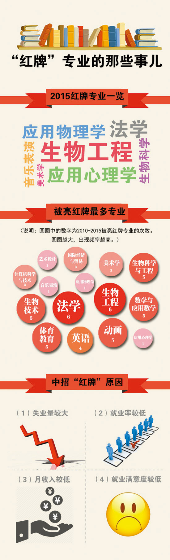 在过去6年的预警榜上,法学和生物工程年年都属于“红牌”专业,动画、生物技术、生物科学与工程、数学与应用数学及体育教育次之,上榜5次;英语专业4次上榜;计算机科学与技术、国际经济与贸易、美术学3次上榜。值得注意的是,在15个历年上榜的“红牌”专业中,5个是理科相关专业,4个与艺术相关。