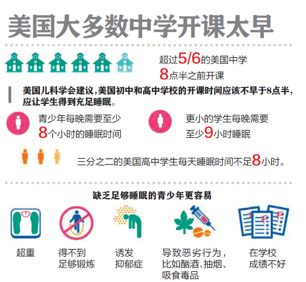 2014年,美国儿科学会曾呼吁中学早晨上课时间不早于8点半,以保证青少年有8个半小时到9个半小时的睡眠。但全美只有17.7%的中学听取了这一建议。