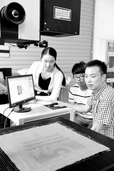 图为学生正在用激光雕刻机在布料上雕刻花饰。