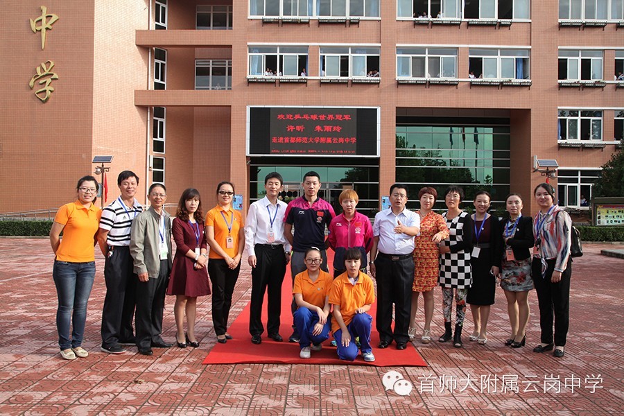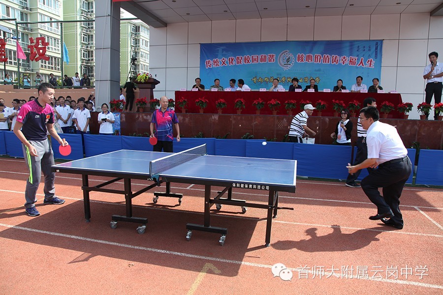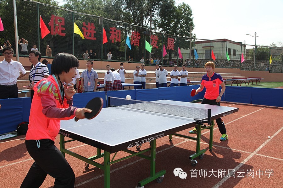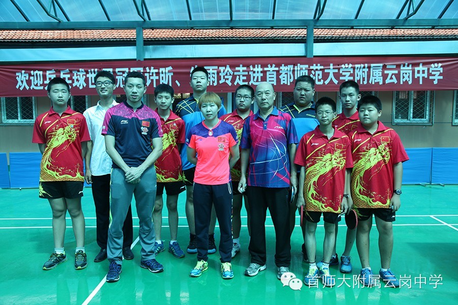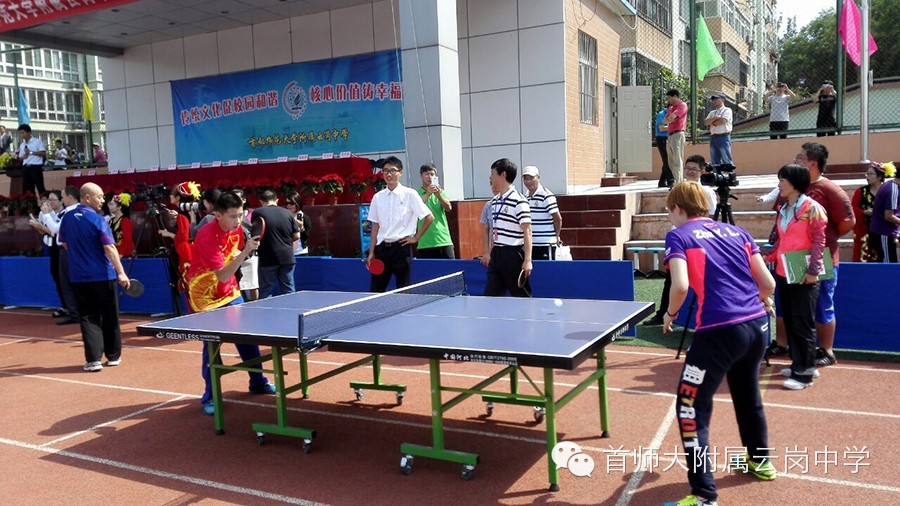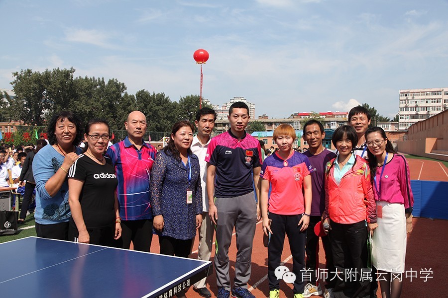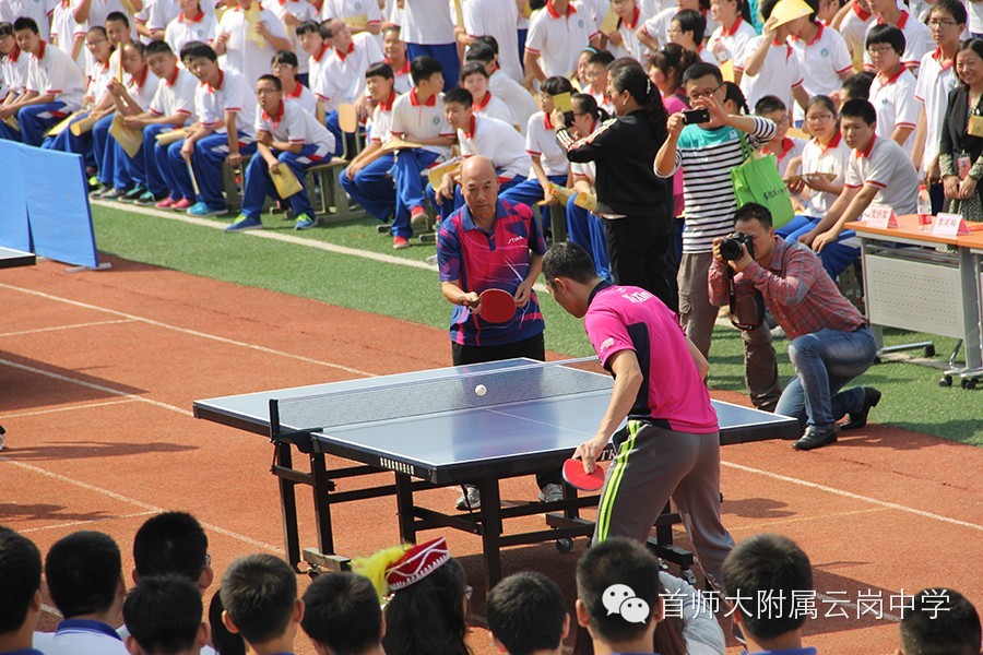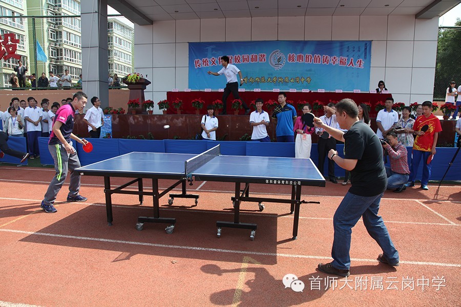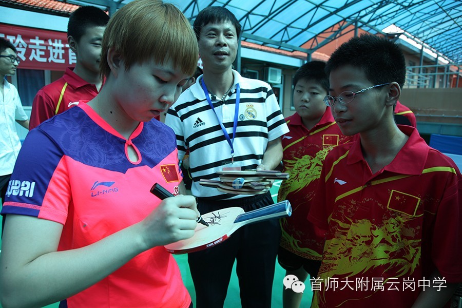 最激动人心的是冠军与学校师生、家长的互动环节,轻盈的小球在灿烂的阳光下来回跳跃,全场加油声、呼喊声此起彼伏。典礼后,冠军们深入学校体育组与体育老师和乒乓球社团同学进行了亲切交流和技术指导,大家受益匪浅。首师大附属云岗中学作为乒乓球传统校,相信在冠军的激励下,乒乓球运动会更加普及,水平会进一步提高!