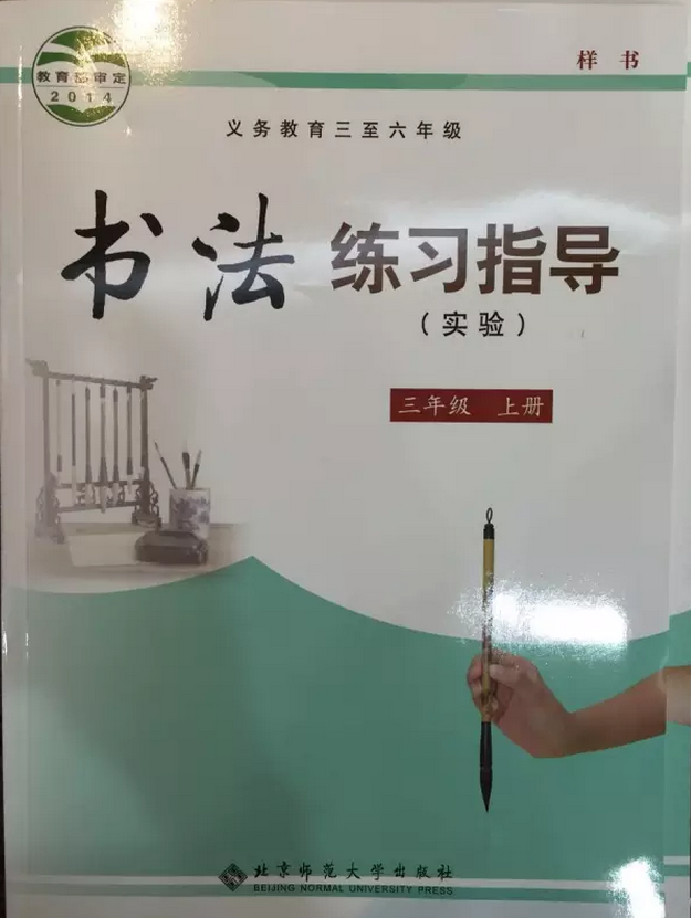 新版书法教材,在封面醒目印刷着“教育部审定 2014”的圆形图标。书名统一称为《书法练习指导(实验)》。