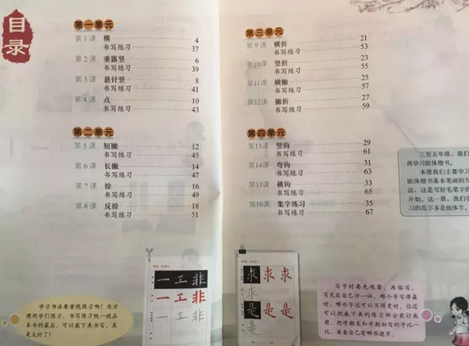 “今年教材升级换代了,我们学校用的是华文出版社的教材,我看了新教材,跟以前相比,内容丰富了不少。以前的书法课本,内容主要讲解笔划写 法、字的间架结构、描红等等。现在的新课本除了教学生如何写毛笔字,还有各种碑帖的比较、每课会介绍两个字的文字源流,另外还有书法家的小故事。应该说新课本更注重对学生传统文化的熏陶。”