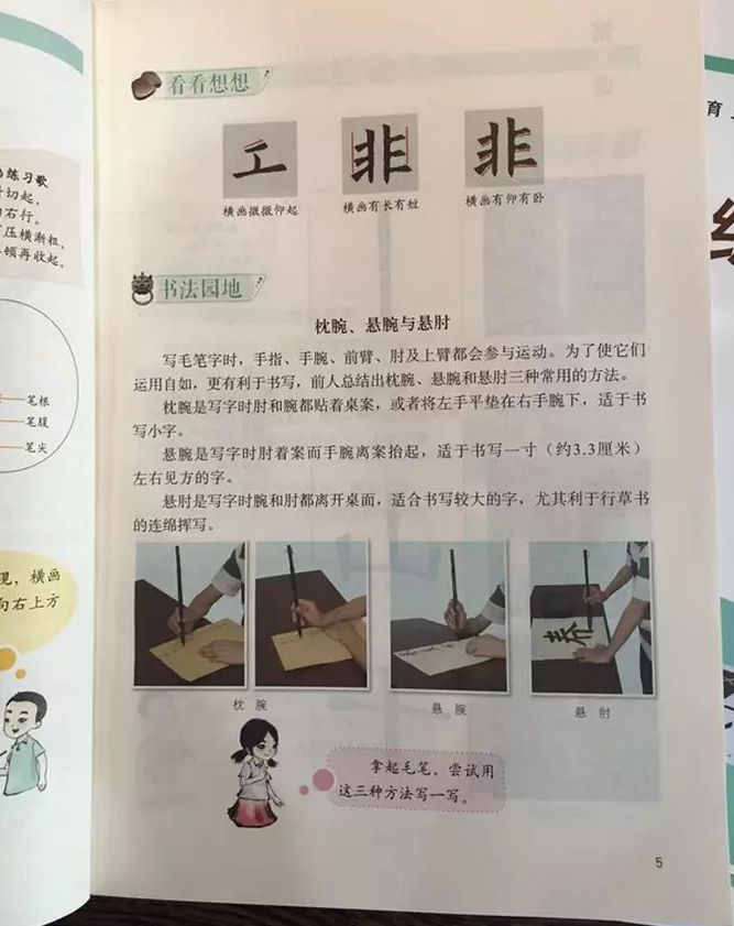 而除了讲解笔划和字的书写要点、给出描红范本之外,三个版本的教材都设置了“书法园地”栏目,介绍与书法相关的知识。例如什么叫枕腕、悬腕、悬肘?楷书四大家是谁?什么叫草书?如何欣赏欧阳询的《化度寺碑》……