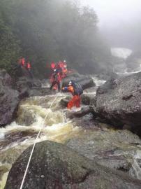 消防官兵拉起牵引绳索救出困在河中坡地的大学生。