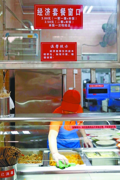 在经济套餐窗口,记者看到菜品有4个:豆芽炒包菜,黄瓜炒香肠、粉丝、大白菜炒肉。精品菜窗口菜品相对丰富,粉蒸肉、油淋茄子、蘑菇炒肉等。其他套餐窗口,一荤一素每份7元,两荤一素每份9元,炒饭每份5元。汤品除了青菜豆腐汤每份不足2元,绝大多数汤品都在每份3元。这就意味着,作为一般的情况,吃饱吃好确实在7元上下。