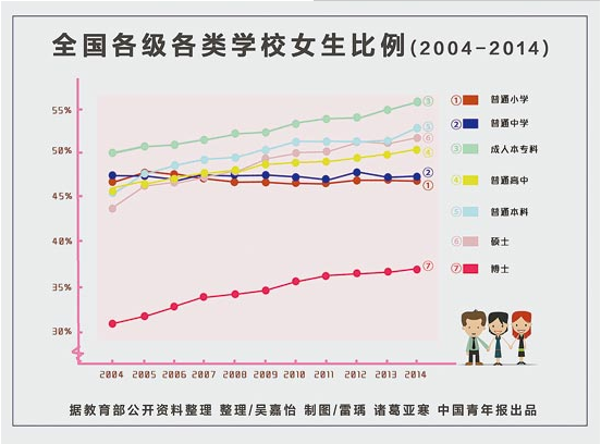 2004年以来,在普通初中和普通小学,女生的比例一直都维持在47%、46%左右;但在大学本专科阶段,女生所占比例从2004年的45.6%增长为2014年的52.12%,硕士生从44.15%增长为52.12%。