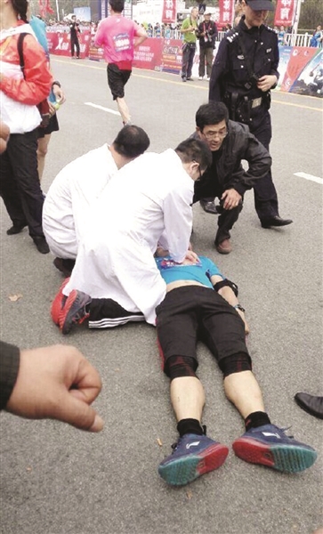在这些选手中,很多业余爱好者参加的是21.0975公里半程马拉松赛。发令枪后,选手们争相往前冲。上午10点30分左右,半程马拉松赛选手的业余选手们正陆续完成冲线。就在这时一名男选手在21公里处突然倒地,现场工作人员立即报告医疗保障组,医务人员现场检查,该选手心脏骤停,神志不清,呼之不应。“当时医护人员对选手抢救时,一边做心肺复苏,一边做人工呼吸。”一位目击者说,现场救援很及时,抢救完后,又立即将伤者送上救护车转至附近的滨湖医院抢救。