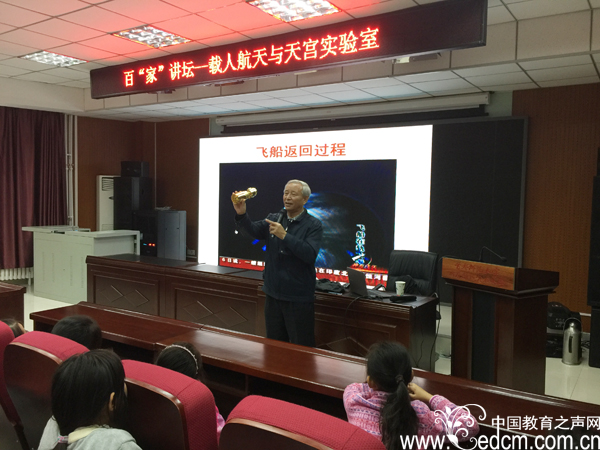 焦维新教授从“宇宙飞船怎样上天和返回、微重力环境奇观、中国的载人航天事业”三方面介绍了航空航天的科学知识。焦教授用精准的数字对比,为同学们介绍了科普航天知识;通过有趣的视频展示,形象地再现了飞船的发射过程和返回过程。老先生谈吐幽默,很快与孩子们打成一片,所举事例既贴近生活,又能激发想象力,让孩子们在欢快地氛围中学习,将高深枯燥的航天航空知识变得生动有趣!