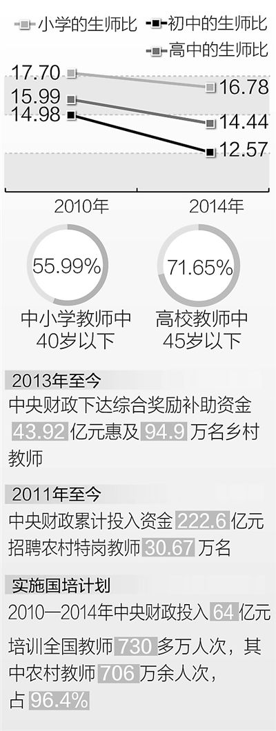 学校生师比逐渐下降。普通小学、初中、高中的生师比,分别从2010年的17.70∶1、14.98∶1、15.99∶1,下降到2014年的16.78∶1、12.57∶1、14.44∶1。同时,中小学教师40岁以下占55.99%,高校教师45岁以下占71.65%,均比2010年有较大幅度提高,中青年教师成为教师队伍主体。