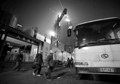 昨天,几名工人从一个已经停止作业的工地中走出。