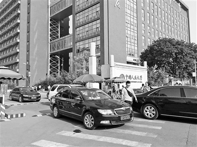 昨天下午,北记者来到了中关村大街上的人民大学探访。目前人大校内并不实行封闭式的管理,其中东、西门均设有电子杆,社会车辆进出需交一定的停车费和通行费。