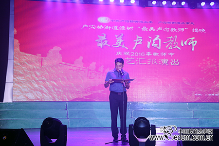 颁奖仪式上,大屏幕上依次展示9位“最美卢沟教师”的介绍短片,他们当中有全国“百佳园长”、“北京市三八红旗奖章”获得者,坚守幼教事业35年的丰台二幼园长游向红;有在中学英语教研方面硕果累累的丰台二中初中执行校长严彩莉:还有2011年不远万里从英国友好学校来到中国执教、促进中英文化交流的大成学校外国专家Alexander Michael Thrower。他们是群众认可、学生爱戴的老师,更是“爱国、创新、严谨、奉献”的“卢沟精神”的践行者。街道希望通过选树这些榜样,能够激励和带动卢沟桥教育集群和辖区教育事业的发展,促进教育资源和社会资源的融合和互通。
