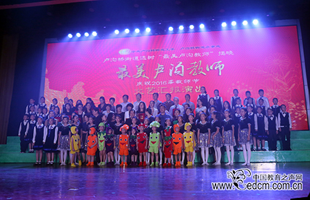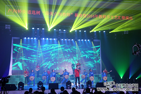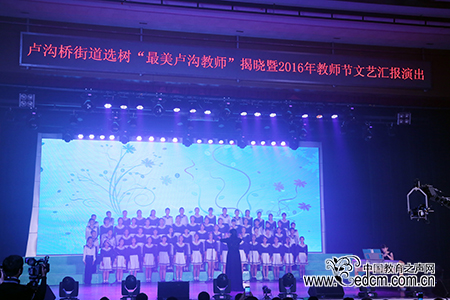 颁奖过后进行了庆祝教师节的文艺展演,辖区学校的师生以及部分社区带来了歌曲、舞蹈、诗朗诵等节目。望园社区圆梦艺术团带来了舞蹈《舞动中国》,明艳的舞裙与灵活的舞步拉开了文艺展演的序幕。北京丰台二中初中部带来了配乐诗朗诵《最美卢沟教师》,这首原创诗歌表达了学生对老师的敬意,以及教师这份职业的神圣与光荣。丰台区第二幼儿园的少儿舞蹈《快乐蔬菜》以可爱的蔬菜服装造型吸引了观众的目光,他们的父母也与他们一起在台上欢快地跳舞。丰台区第五小学的合唱《卢沟谣》将观众带回到历史,以此明志。北京丰台二中初中部的女子打击乐团表演了十送红军,与观众一起回忆峥嵘岁月。全场节目的高潮由北京教育学院附属丰台实验学校的教师们带来了T台走秀《靓颖人师》,漂亮帅气的舞台装与摩登的台步引起了全场的阵阵惊呼与叫好。文艺展演在北京大成学校《礼》、《听泉》的合唱中落下了帷幕。