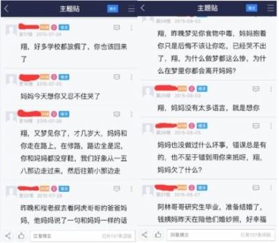 2016年2月的一天,阿翔的母亲打开贴吧时,却发现登录不上自己的账号,并找不到之前发的所有贴子。四年多的思念点滴一下消失,坚强的母亲也控制不住自己的情绪了,她在贴吧反复发贴求助:“这么多年,妈妈的梦,妈妈和你的交流都没有了,心都快碎了,一定和那个被盗号码有关,他为什么要删掉,太坏了,太坏了。”“翔,谁可以帮妈妈恢复那些贴子,谁可以?”