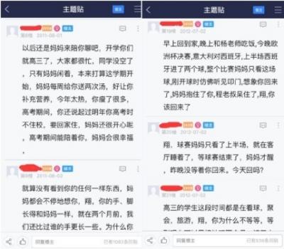 虽然孩子已经离开,但在4年间的发贴中,母亲的爱始终如一的浓烈,就像孩子依然在身边一样。“开学你们就高三了,这学期开始,妈妈每周给你送两次汤,给你补充营养”、“别忘了,每天吃一个苹果,一盒牛奶”,令不少看到贴子的网友表示心痛到哭崩。2014年世界杯期间,母亲还陪喜爱足球的儿子一起看球,“翔,你认为德国还是法国队赢,妈妈可是看好德国队。”