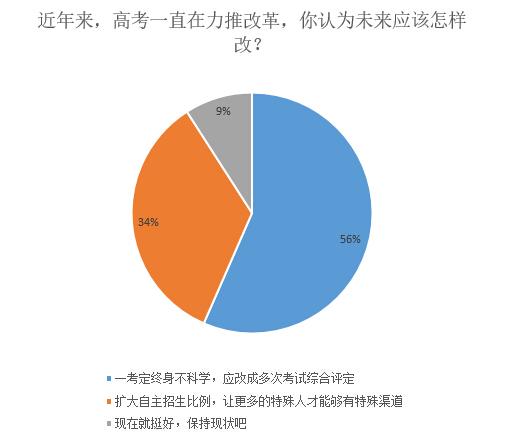 关于高考应该如何改革,56%的网友认为应该取消现有的“一考定终身”的考试制度,采取多次考试综合评定的方式。还有34%的网友认为许多有特殊才能的人也应该获得接受更好教育的机会,因此高考改革应该扩大自主招生比例。只有9%的网友表示“改啥改,高考现在这样就挺好的,还是保持现状吧!”。