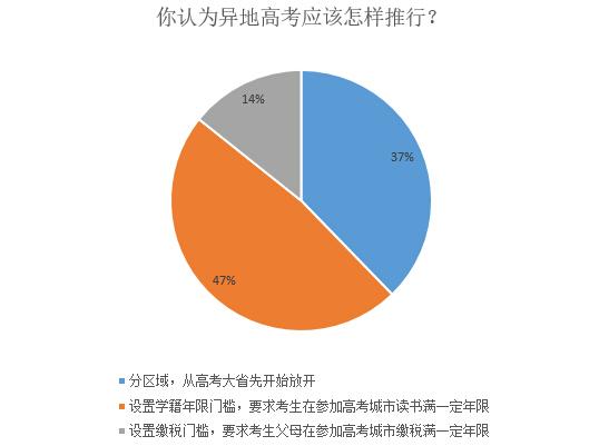 既然大家都十分赞成开放异地高考,自然有不少网友就已经开始操心“异地高考”应该如何推行了~数据显示,有47%的网友认为,推行异地高考还是需要设置一些门槛的,而最好的方式是施行“学籍障碍制”,即要求考生在参加高考的城市读书满一定的年限。