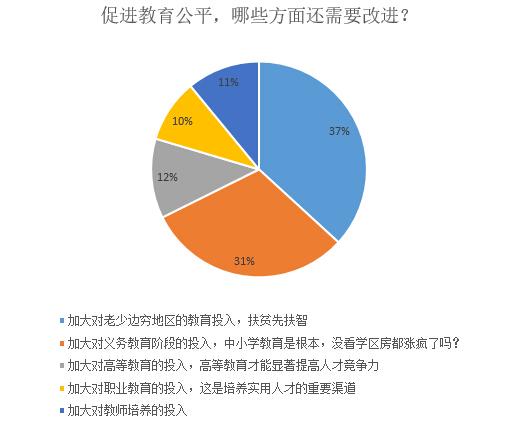 大部分网友认为促进教育公平,当下最需要改进的是加大对老少边穷地区的教育投入。还有31%的网友选择了加大对义务教育阶段的投入。