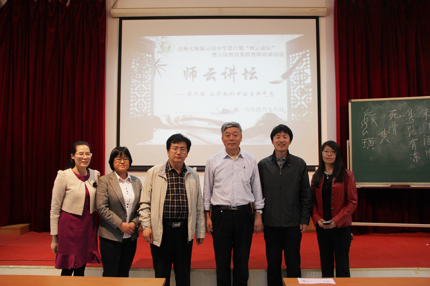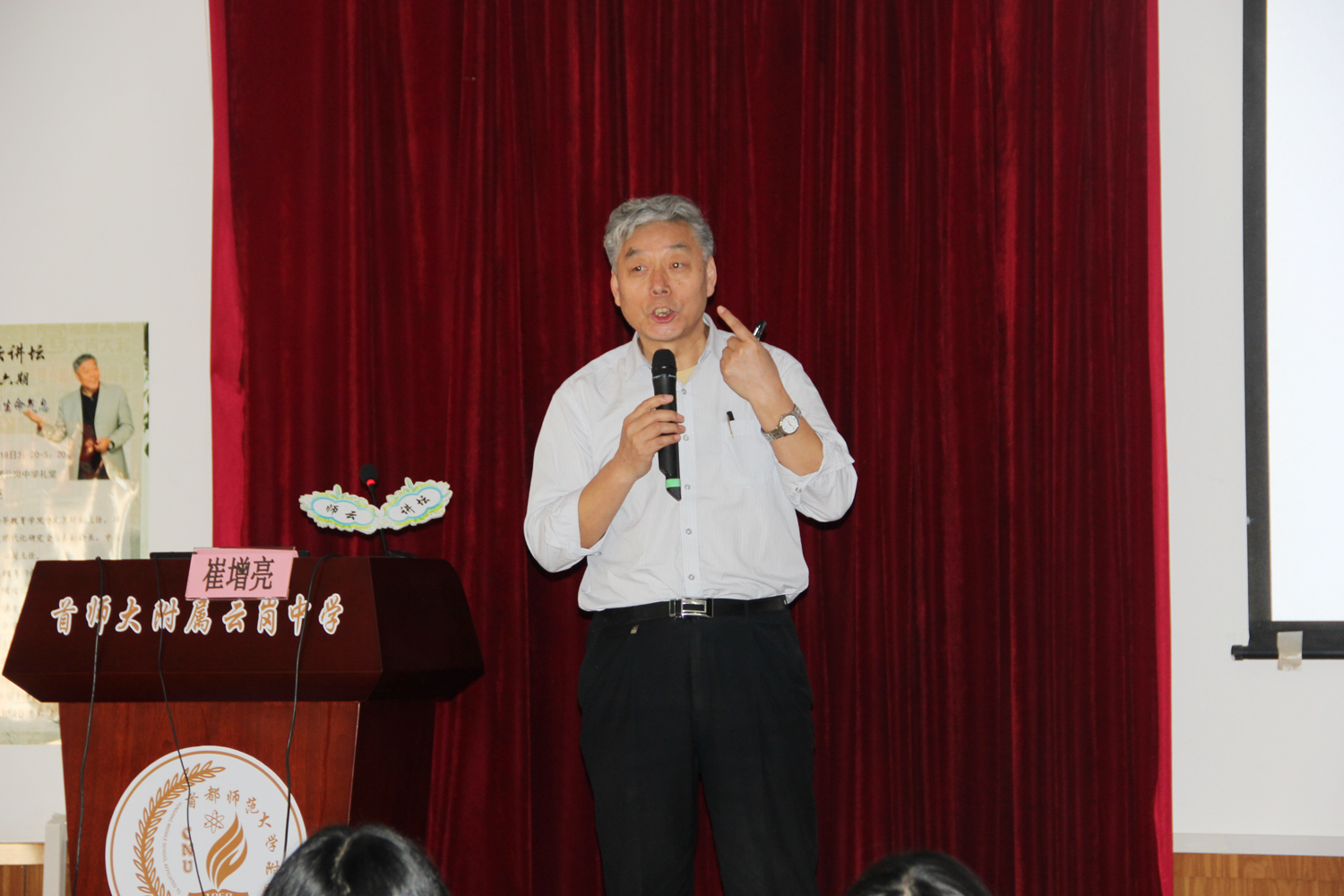 下午3点,崔增亮教授在云岗中学礼堂进行了《汉字构形中的生命气息》的专题讲座。讲座由首师大附属云岗中学德育副校长张冬梅主持,她首先回顾了前五期“师云讲坛”的精彩内容,然后向大家介绍崔增亮教授,并代表所有老师对崔教授的到来表示热烈的欢迎。崔增亮教授是首都师范大学初等教育学院中文教研室主任、硕士生导师、北京语文现代化研究会常务副会长、中国儿童文学教育研究中心副主任。崔教授从事师范教育30余年,主编的《古典文学》成为高等师范院校主修教材,主编的《小学古诗教学研究》对小学古诗教学有一定的指导意义,主编并出版《字源识字教学手册》、《汉字学与小学识字教学》成为小学语文教师必备用书,影响较大。
