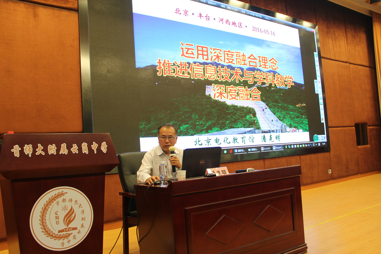 活动初始主持人首都师范大学附属云岗中学副校长傅国辉向全体与会教师介绍了潘克明馆长的相关情况,潘克明教授是原北京电化教育馆馆长,现代教育技术特级教师。首都师范大学、东北师范大学特聘教育硕士导师,中国教育技术协会副会长;全国中小学电化教育专业委员会常务委员;教育部全国中小学现代教育实验学校专家指导委员会专家;多年以来一直参与教育部重点课题研究,主持多项中央电教馆、北京市教育科学研究课题,主持的课题参与学校近200所,参与教师数千人,同时应邀担任全国近百所中小学的课题研究顾问或现代教育技术顾问。曾发表教育技术研究论文数百篇、作相关学术报告数百场,编写教育技术专著多部。