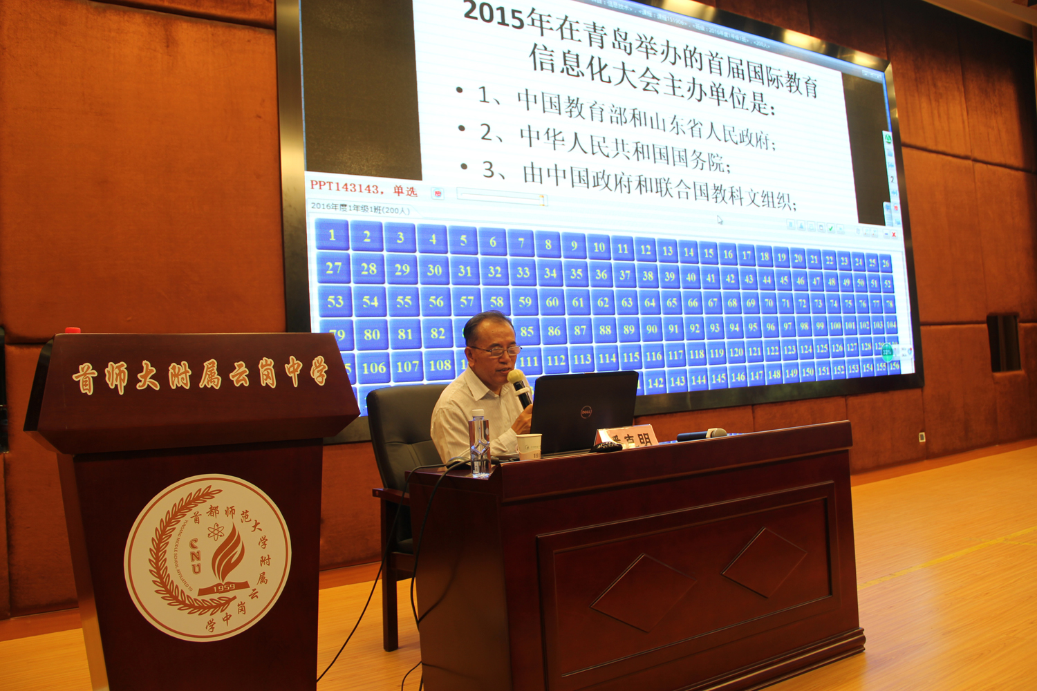 【必威体育官网网页版 5月18日消息】为积极推动信息技术与教育融合创新发展,共同探索教育可持续发展之路,迅速将深度融合的理念落到实处,2016年5月16日首都师范大学附属云岗中学第七期“师云讲坛”暨云岗教育集群教师培训活动在阶梯教室隆重举行,活动邀请了原北京电化教育馆馆长、现代教育技术特级教师潘克明教授进行《运用深度融合理念推进信息技术与学科教学创新融合》主题讲座。来自北京十中、首都师范大学附属云岗中学、长辛店学校、长辛店第一中学、首都师范大学附属云岗小学、嘉萌幼儿园等学校100多名教师认真聆听了本次讲座。