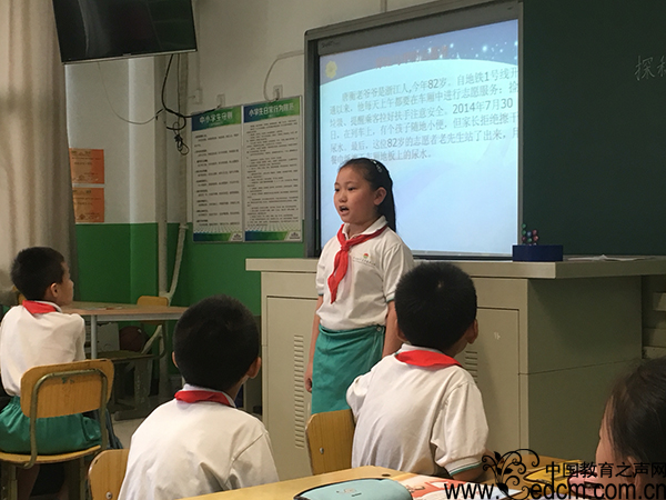 志愿者活动展示课是本次研讨会的高潮,学校推出了九节精彩的展示课供嘉宾们选择。一二年级侧重于探秘志愿者和争当志愿者的课程、三四年级是践行志愿者的课程、五年级则是反思志愿者的课程。一2班的亲子志愿者课程最为热闹,家长与孩子一起选择服务岗、制定家庭服务计划,计划切实可行,充分调动了孩子的积极性;四3班的环保志愿者让人耳目一新,摒弃了传统的说教方式,而是通过动手实践以及小组讨论的方式,真正教会学生通过变废为宝的形式去社区宣传环保,时效性强。小志愿者们结合自己的亲身体验将自己的感受与大家分享,提出自己的困难大家研讨解决。在分享和讨论的过程中,学生对志愿精神有了更深入的认识。此次研发与实施的志愿服务课程赢得了专家和领导的一致好评。中国教育学会教育管理分会理事长马宪平提出:“我们的教育就是要向这样的,把学生从概念化教学中解脱出来,不要传授过多概念,应该向实际体验转变。”